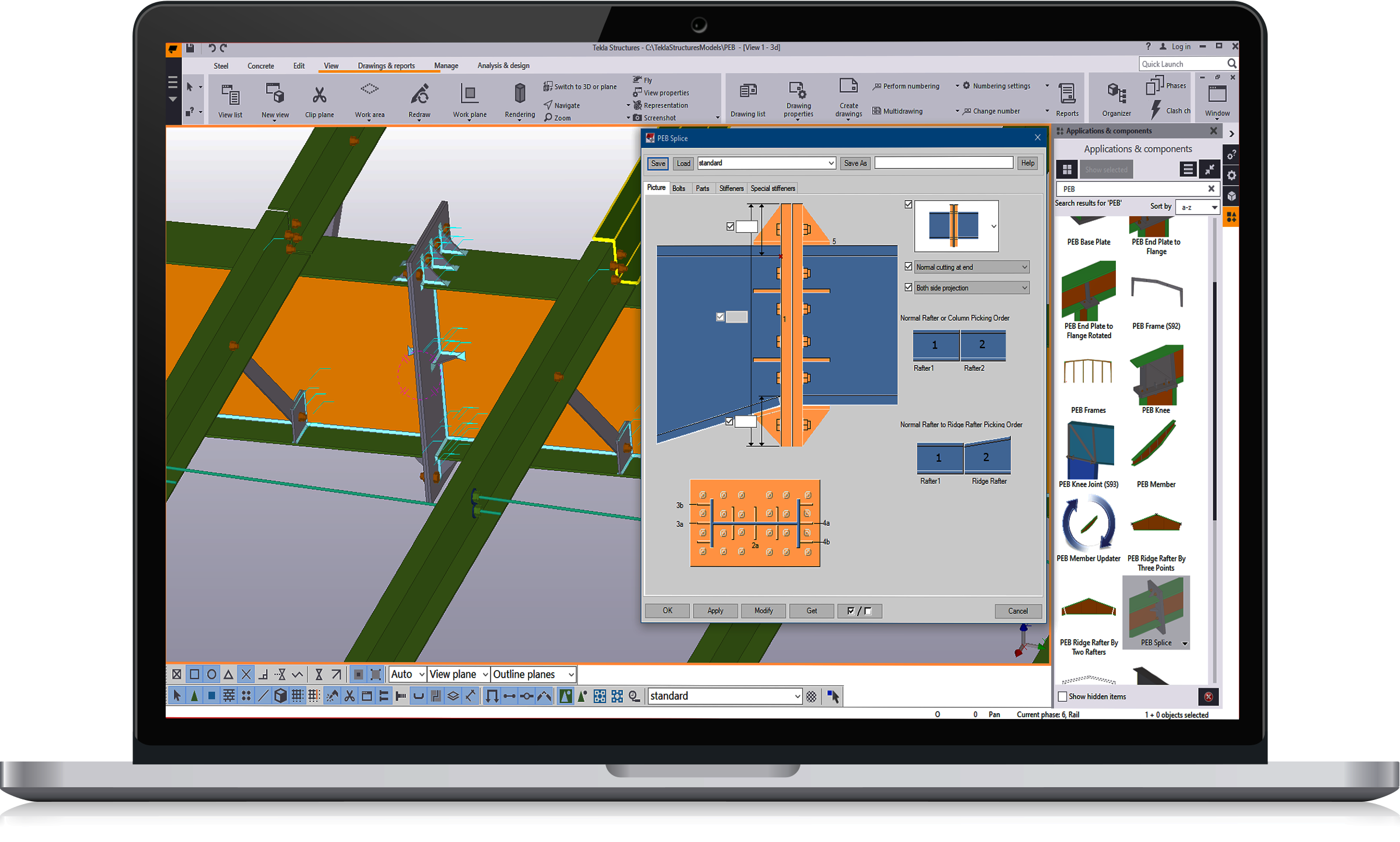 PEB are set of tools which helps to model Special Structures and Pre-Engineered Buildings Systems (PEB).in Tekla Structures. Especially in modeling rigid frames with overhead cranes and also multi-Span frames. It is user friendly plugin or macro for modeling special steel buildings in a quicker and easier way in Tekla Structures. This PEB Tools Pack include: 1.PEB Member - multi depth web, multi plated and more. 2. PEB Baseplate - fixed, pinned and more. 3. PEB Knee - Horizontal/Vertical/Sloped/Aligned 4. PEB Splice - Vertical/Ridge splice 5. PEB End plate to Flange (Interior column connection) 6. Ridge Rafter 7. PEB Frames - Clear span, Multi span, Lean To, Lean To multi span 8. PEB Member updater - Updates selected/ all PEB Members to change itself as per the connection applied to it. PEB Member is maintaining design depth after applying connections. 9. PEB Anti-Sag Roof and Wall 10. PEB Anti-Sag Apex 11. PEB End Plate to Flange Rotated 12. PEB Steel Line. 13 Multi Depth Stiffener' for PEB.