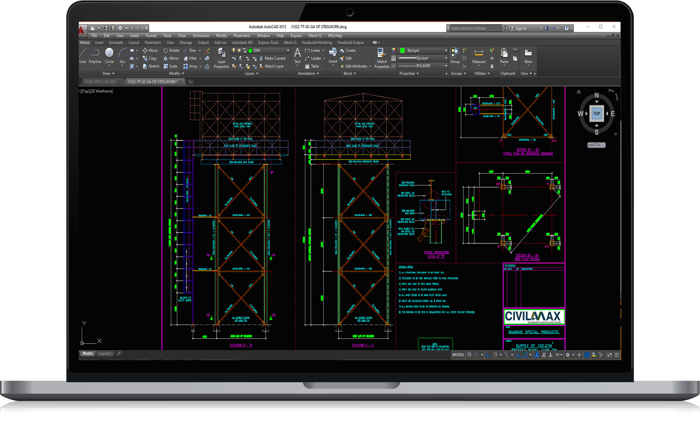 This tank tower is 9m in height, on a 3m x 3m column bases for 33m³ tank reservoir. We design our tower with a suitable seismic and wind loads to relevant British Standards, when a constant pressure head of water is required for supply purposes, tanks are mounted on a steel tower at a suitable height. A full set of detailed drawings for the tower and 33m³ steel tank, which includes general arrangement, single parts and assembly drawings, all in DWG file format or AutoCAD. Packing list, bolt list and material list are part of the set, these drawings are professionally detailed, checked and ready for fabrication and on-site erection.